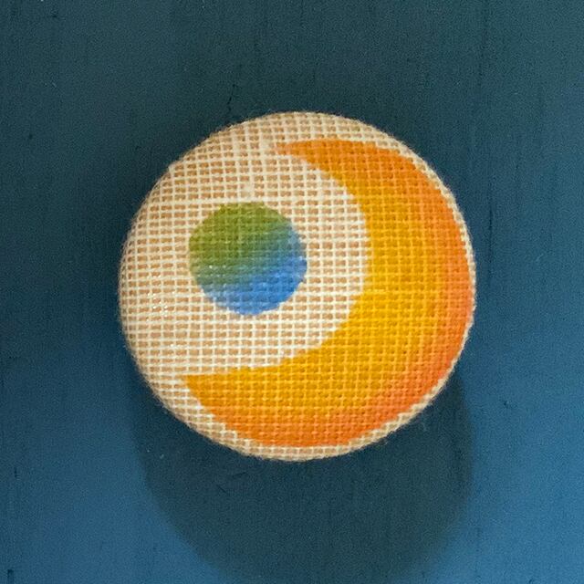 ステンシルを施した遠州木綿のくるみボタンをバッジにしたものです。名前は遠州ボタンとしていますが、筆でステンシルをしたオリジナル版画作品のバッジです。どこかノスタルジックを感じるバッジは複数をカバンなどにつけても素敵です。直径約3cm。